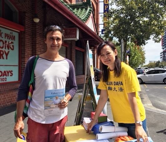 家住霍桑区(Hawthorn)、退休前是学校老师的莫诺斯(Helen Manos)女士在唐人街看到法轮功的真相点,象见到老朋友一样与学员寒暄祝贺新年快乐。自从几年前了解到法轮功在中国遭受残酷迫害,她就自发地开始为法轮功奔走,面见议员、给外交部长写信等等。 她说:“几年前,通过人权组织了解到法轮功学员被(中共)活摘器官而杀害,对全世界来说,这都是完全违反人权的,中共政权必须对国际社会有个交代。” “西方社会绝对不能对此置之不理,所以我认为澳洲政府应该发出声音,面对面向这个贸易伙伴提出对方糟透了的人权问题。” 她最后说:“我认为,法轮功的原则‘真善忍’是普世的价值观,是应该被所有人在心里珍存的品德。”  图2:格里默尔(Lyndon Grimmer)先生在和法轮功学员交谈。 |