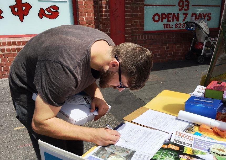 厨师伯切尔(Brian Burchell)先生在呼吁制止中共迫害法轮功的征签表上签了字,当天是他第一次听说法轮功。得知法轮功学员是中共主导、系统地进行活摘器官牟利的主要受害者后,他感到非常震惊,质疑这样的事情为什么没有得到广泛的报导,“这样可怕的事情,为什么我会不知道呢?简直比纳粹还要残忍啊。” “我也觉得很吃惊,为什么还允许这样的事情继续进行呢?真令人难过。我回去后会告诉同事们我今天看到的一切。” “如果不允许人们相信‘真善忍’的价值观,显然人人都会变坏了。”他最后说,“澳洲政府应该和其它国家联手,共同制止迫害。希望事情能尽快有所转机。” 中国留学生小池看到法轮功的真相摊位很开心,他说:“在国内,我妈、我姨、我两个姑姑都修炼法轮功,我在自己家里和姑姑家里都能看到真相资料。今天看到这个真相点,感到很欣慰。” 他说,自己和妻子很早就已经做了“三:退.”(即退出中共党、团、队组织)声明。 当天,有十九位华人在和法轮功学员交谈后决定退出中共党、团、队组织。