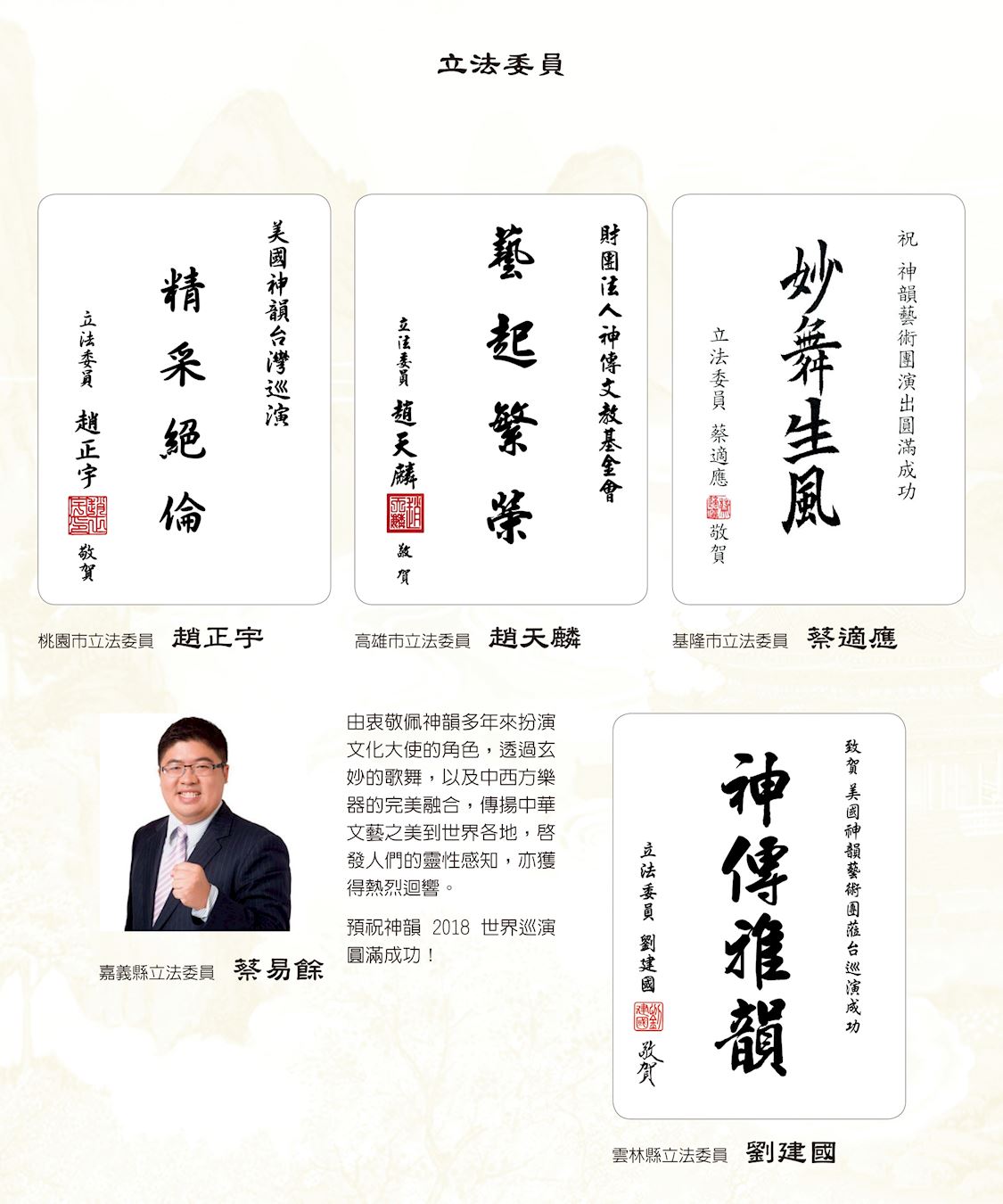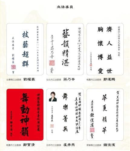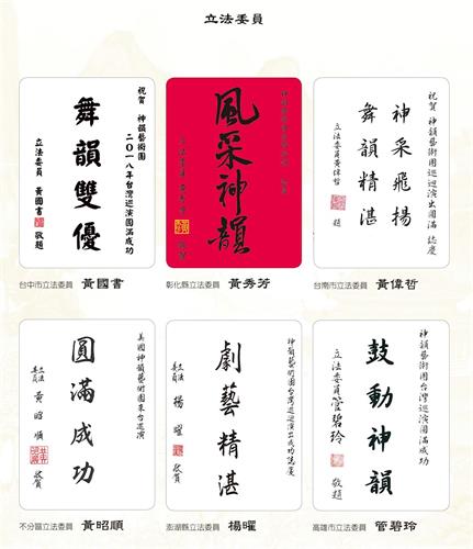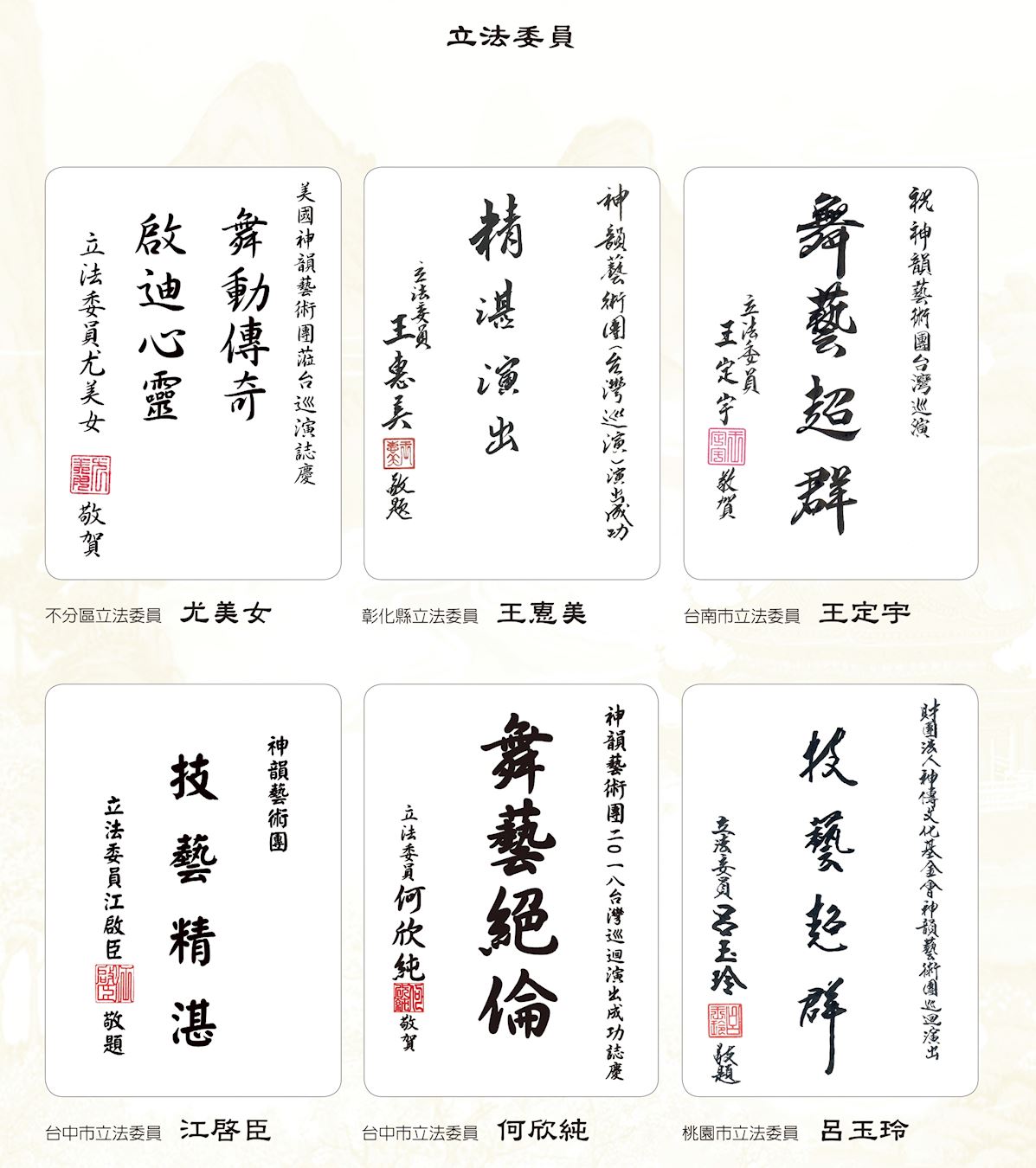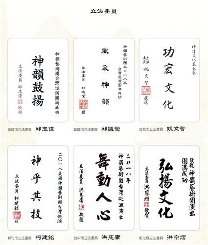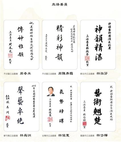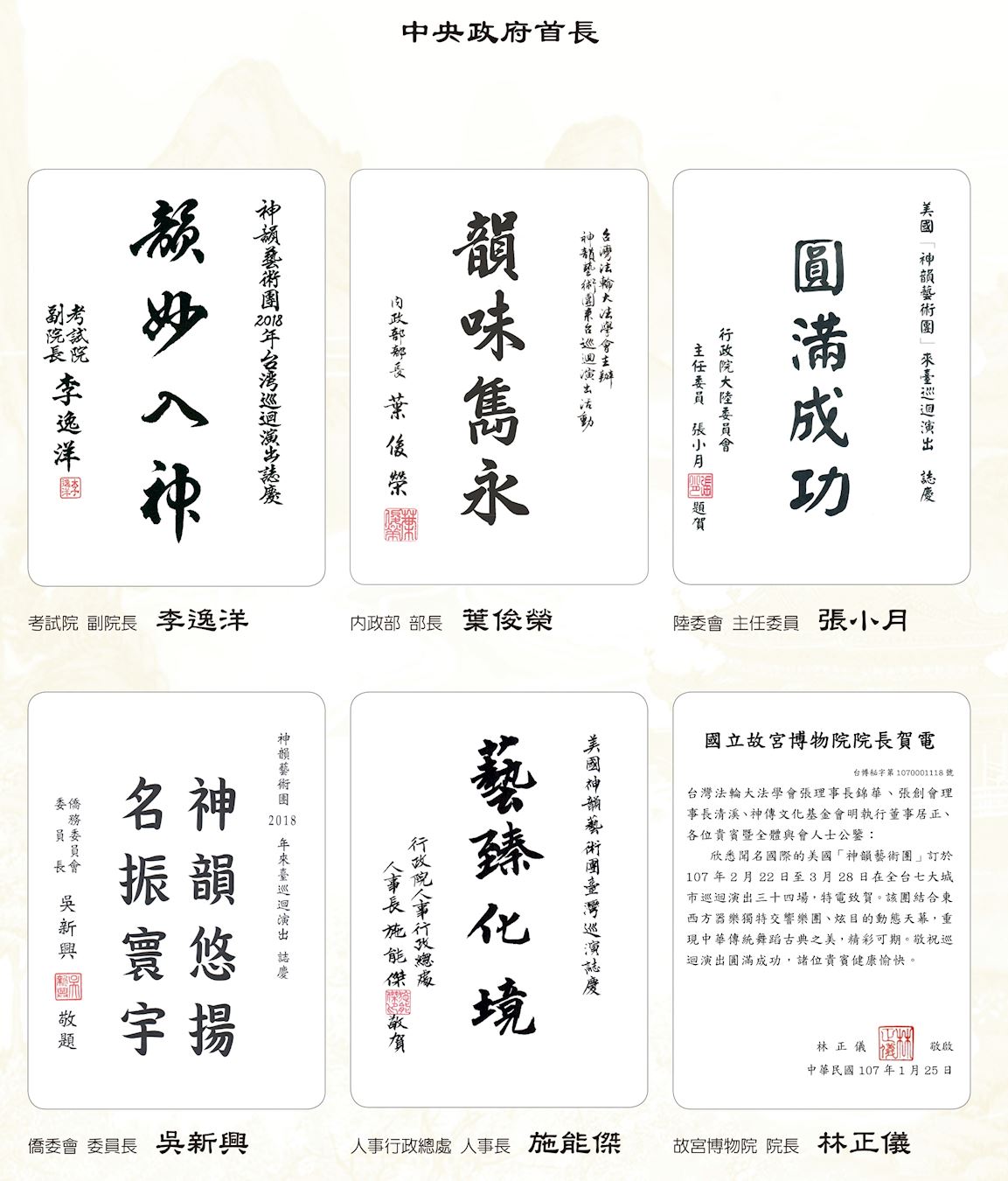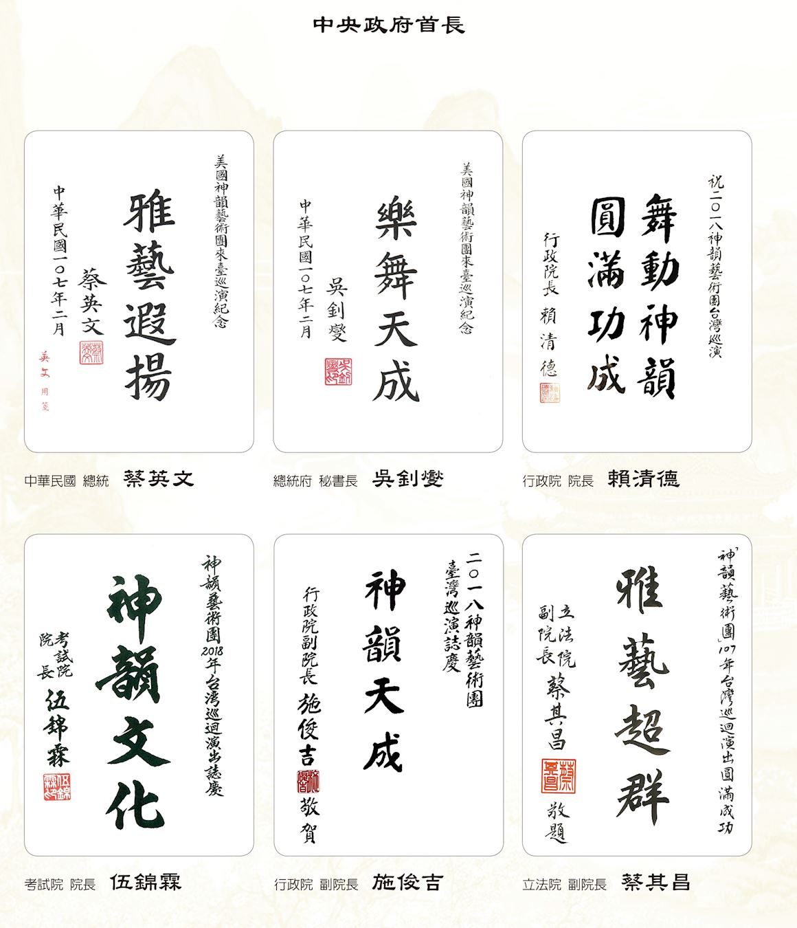 神韵在台湾开演前夕,近百位各级首长政要,纷纷发出贺文和贺词,欢迎十二度莅临台湾演出,对神韵用精湛的艺术形式,复兴中华传统文化的使命,给予热情的褒奖和祝贺。 包括总统蔡英文、行政院长赖清德、总统府秘书长吴钊燮、考试院长伍锦霖等十二位中央部会首长,与新北市朱立伦等十八位地方政府首长、六十四位立法委员及二位地方议会正副议长。 台湾中央部会齐贺热迎 总统蔡英文以“雅艺遐扬”推崇神韵演出声名远播;行政院长赖清德以“舞动神韵,圆满功成”祝贺神韵;总统府秘书长吴钊燮赞贺神韵“乐舞天成”;连年发出贺词的考试院长伍锦霖用“神韵文化”一词迎贺神韵。  图2:中华民国总统蔡英文、总统府秘书长吴钊燮、行政院长赖清德、考试院院长伍锦霖、行政院副院长施俊吉、立法院副院长蔡其昌赞扬神韵。 |