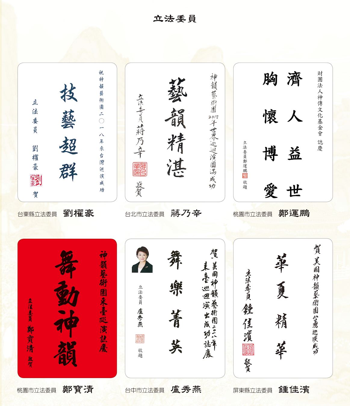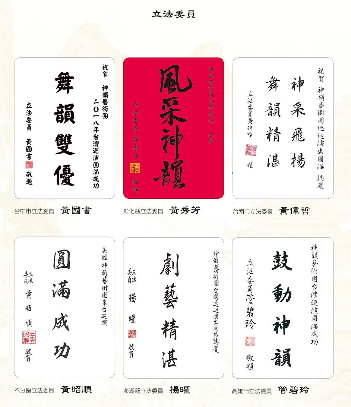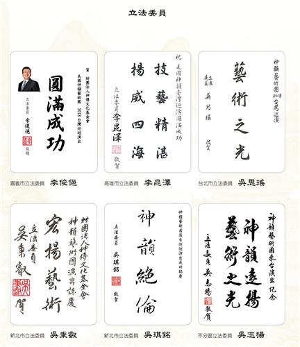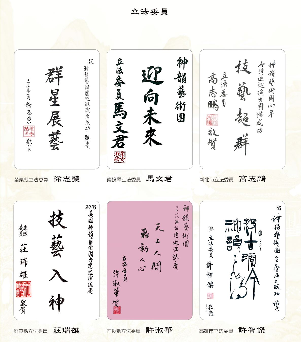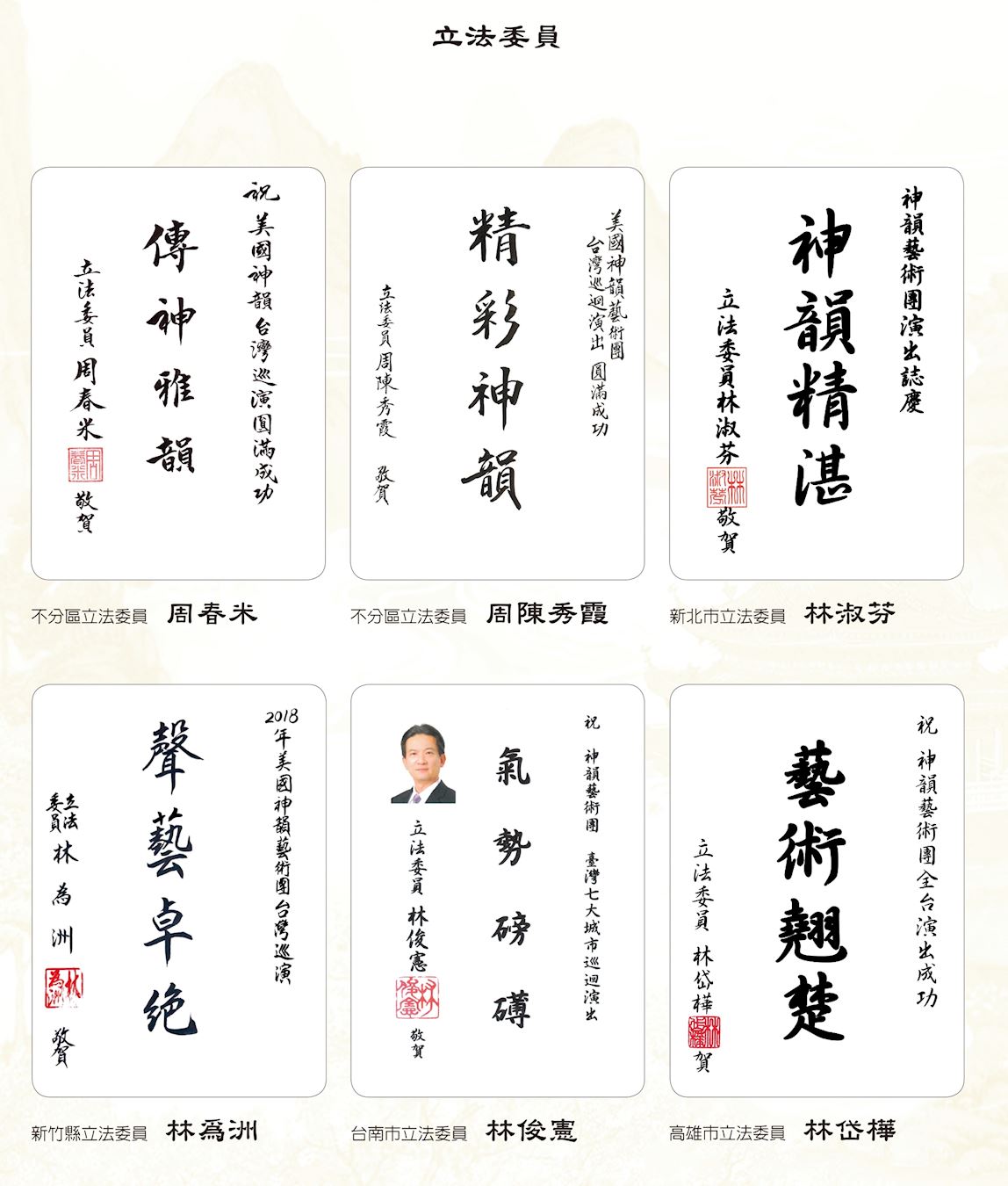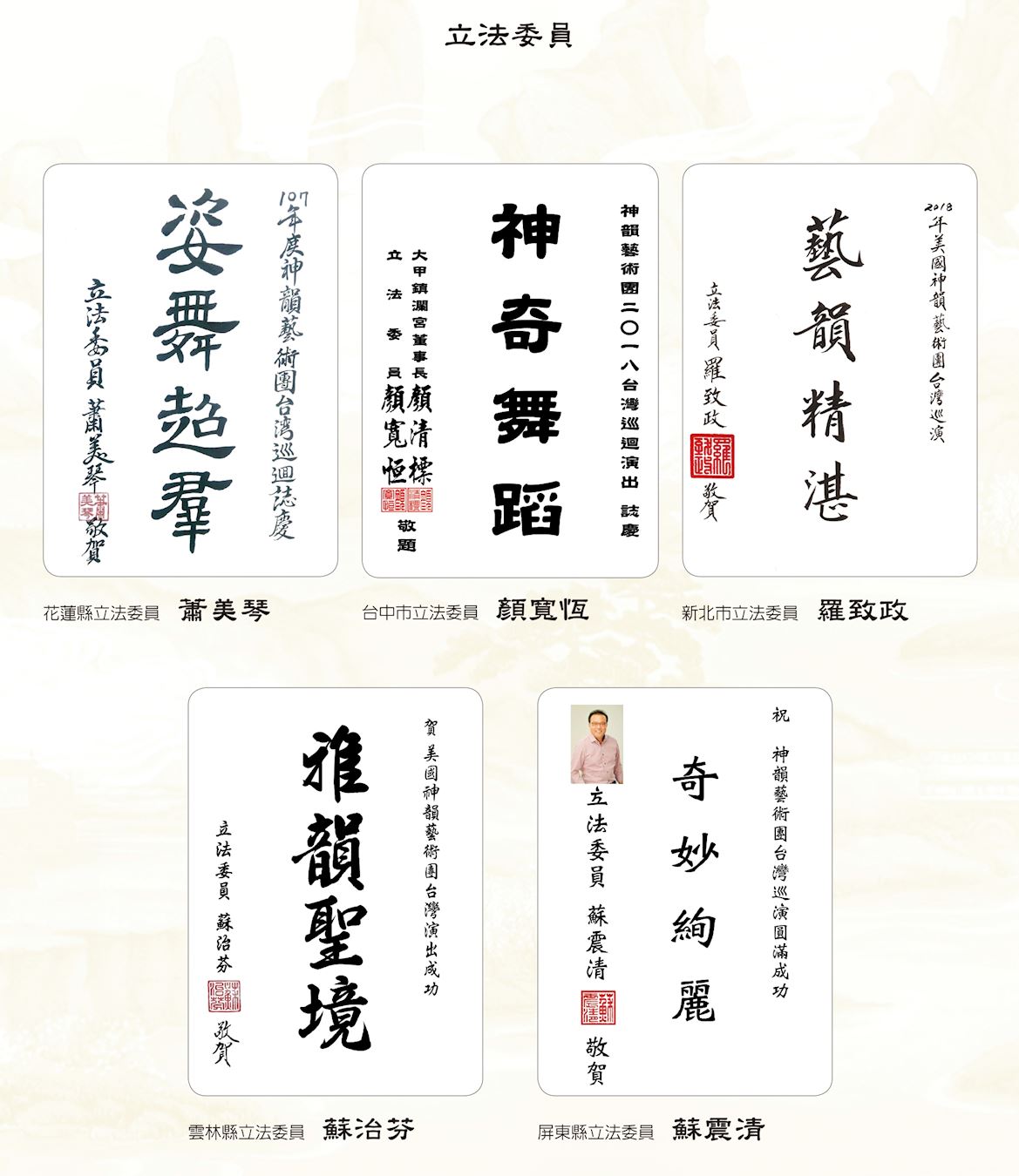 神韵在台湾开演前夕,近百位各级首长政要,纷纷发出贺文和贺词,欢迎十二度莅临台湾演出,对神韵用精湛的艺术形式,复兴中华传统文化的使命,给予热情的褒奖和祝贺。 包括总统蔡英文、行政院长赖清德、总统府秘书长吴钊燮、考试院长伍锦霖等十二位中央部会首长,与新北市朱立伦等十八位地方政府首长、六十四位立法委员及二位地方议会正副议长。 台湾中央部会齐贺热迎 总统蔡英文以“雅艺遐扬”推崇神韵演出声名远播;行政院长赖清德以“舞动神韵,圆满功成”祝贺神韵;总统府秘书长吴钊燮赞贺神韵“乐舞天成”;连年发出贺词的考试院长伍锦霖用“神韵文化”一词迎贺神韵。  图2:中华民国总统蔡英文、总统府秘书长吴钊燮、行政院长赖清德、考试院院长伍锦霖、行政院副院长施俊吉、立法院副院长蔡其昌赞扬神韵。 |