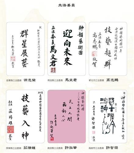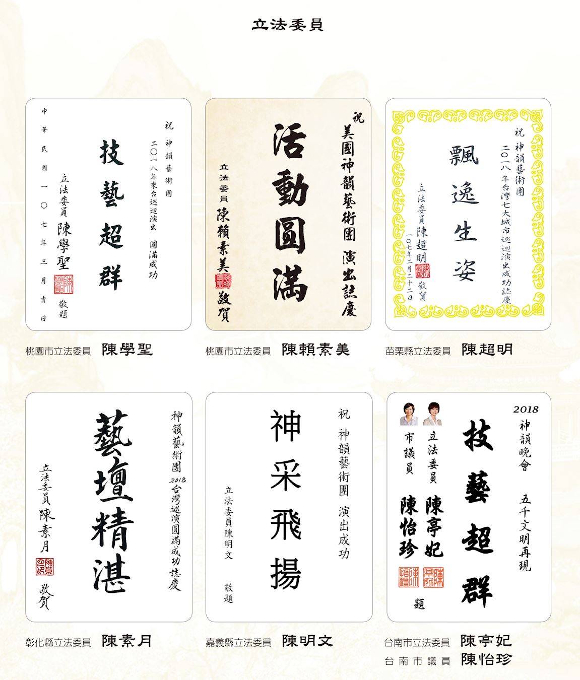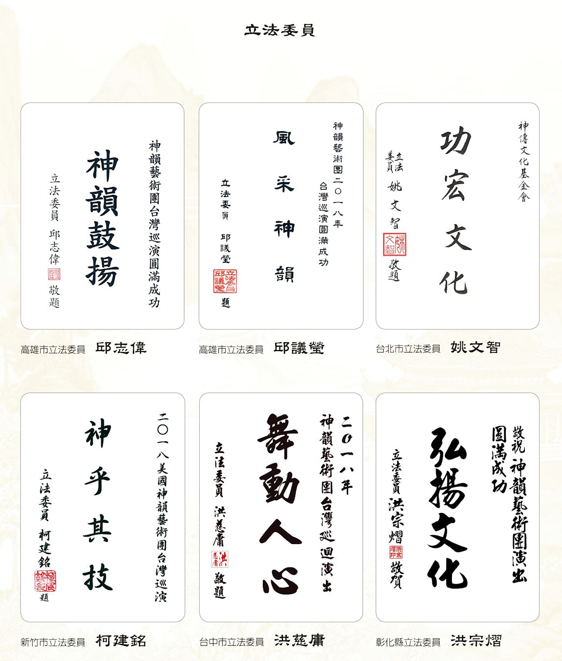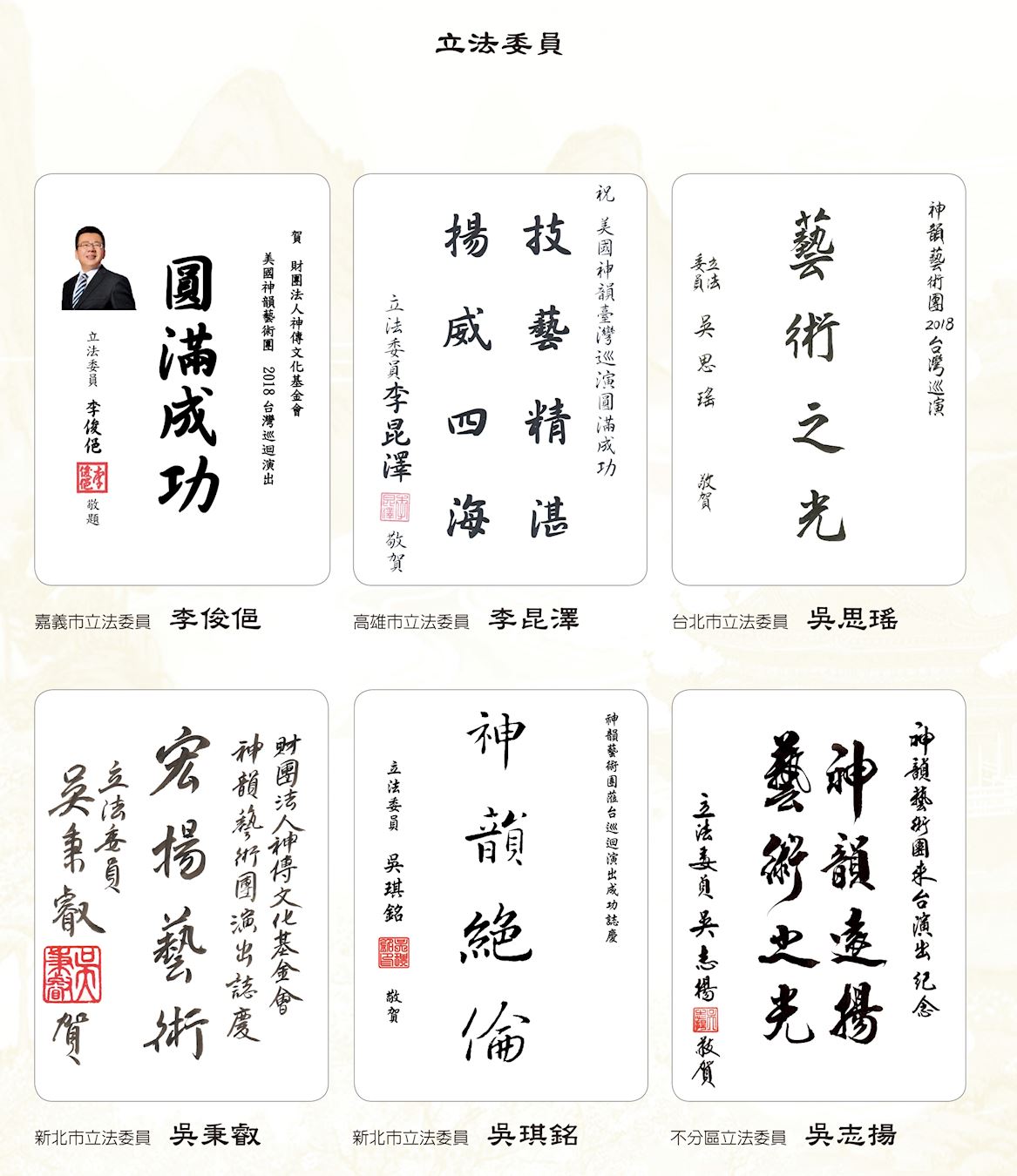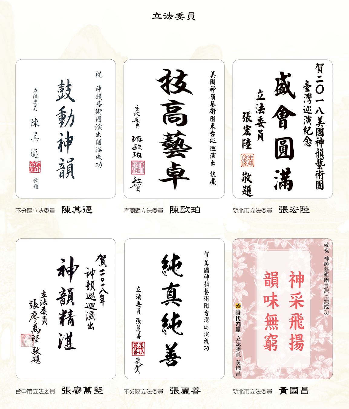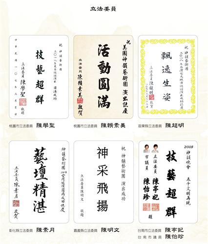 神韵在台湾开演前夕,近百位各级首长政要,纷纷发出贺文和贺词,欢迎十二度莅临台湾演出,对神韵用精湛的艺术形式,复兴中华传统文化的使命,给予热情的褒奖和祝贺。 包括总统蔡英文、行政院长赖清德、总统府秘书长吴钊燮、考试院长伍锦霖等十二位中央部会首长,与新北市朱立伦等十八位地方政府首长、六十四位立法委员及二位地方议会正副议长。 台湾中央部会齐贺热迎 总统蔡英文以“雅艺遐扬”推崇神韵演出声名远播;行政院长赖清德以“舞动神韵,圆满功成”祝贺神韵;总统府秘书长吴钊燮赞贺神韵“乐舞天成”;连年发出贺词的考试院长伍锦霖用“神韵文化”一词迎贺神韵。  图2:中华民国总统蔡英文、总统府秘书长吴钊燮、行政院长赖清德、考试院院长伍锦霖、行政院副院长施俊吉、立法院副院长蔡其昌赞扬神韵。 |