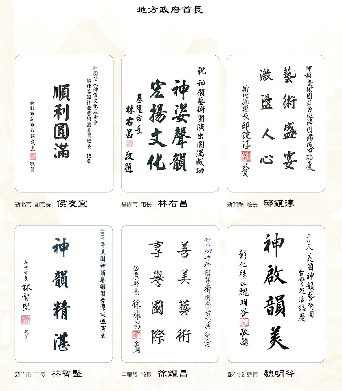 而新北市副市长侯友宜、基隆市长林右昌、新竹县长邱镜淳、新竹市长林智坚、苗栗县长徐耀昌、彰化县长魏明谷、嘉义县长张花冠、嘉义市长涂醒哲、屏东县长潘孟安、宜兰代理县长陈金德、澎湖县长陈光复、金门县长陈福海等地方县市长也纷纷以“气势磅礴 激荡生命”、“艺韵传神 名扬国际”、“神韵深远”、“音姿精湛”、”艺臻化境”、“演艺精湛”、“神韵再现 精彩绝伦”、“声韵俱佳”等贺词欢迎神韵莅临。 “神韵莅临台湾七大城市演出,瀛海春至,神韵雅韵将风靡台湾。”云林县长李进勇的贺词说,“美国神韵艺术团的演出有深厚的文化内涵,英雄传奇故事,及多元民族的奔放活力,此丰富而优美的艺术于舞台呈现;交响乐团现场伴奏,澎湃与柔美兼蓄,融合东西方乐器特色,舞乐相得益彰。相信神韵纯正纯善的演出,对社会人心的涤洗深具意义。”  图5:新北市副市长侯友宜、基隆市市长林右昌、新竹县长邱镜淳、新竹市长林智坚、苗栗县长徐耀昌、彰化县长魏明谷赞扬神韵。 |