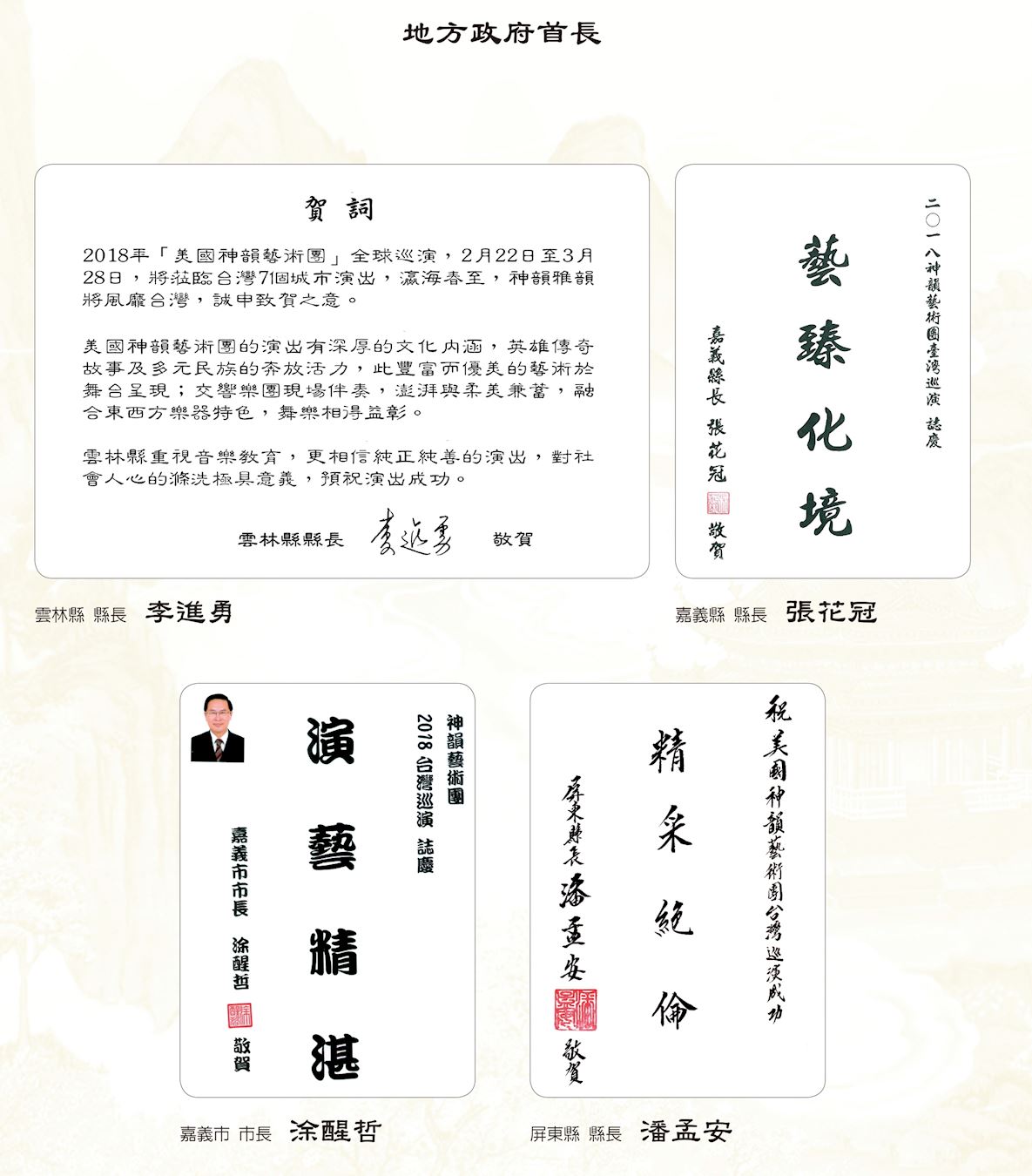 地方县市首长贺词迎神韵 神韵今年将在台湾七大城市演出,各城市市长也热情迎贺神韵,包括新北市长朱立伦、桃园市长郑文灿、台中市长林佳龙、台南市长代理市长李孟谚等十八位地方政府首长均发贺词表彰神韵,祝神韵演出成功。 新北市长朱立伦祝贺神韵演出“圆满成功”、桃园市长郑文灿赞贺神韵“传道宏艺”,台南代理市长李孟谚以“神舞与共,韵现美乐”迎贺神韵。 台中市长林佳龙则说:“十二年来巡回全球百大城市顶级剧院的神韵艺术团,结合东西方文化艺术底蕴,展现独树一格的舞剧张力及壮观宏大的艺术体验。二零一八年的演出除了带给民众触人心弦的剧场经验外,更以精彩绝伦的演出添润台中文化城的丰富内涵。”  图4:各城市市长包括新北市长朱立伦、桃园市长郑文灿、台中市长林佳龙、台南市长代理市长李孟谚等都代表市民发出贺文,恭迎神韵访台。 |