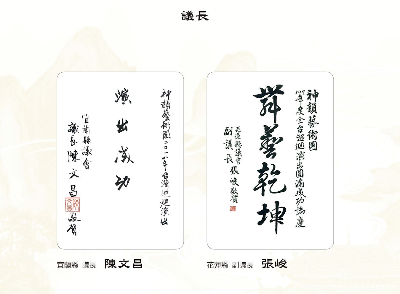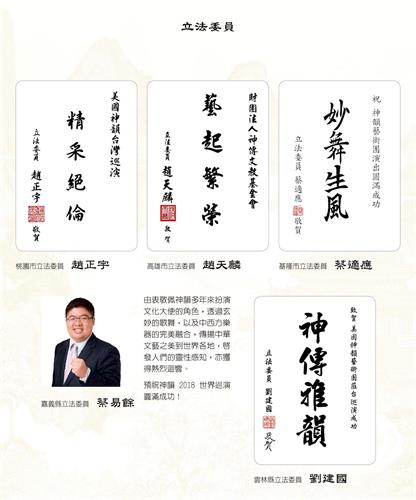 台东县长黄健庭贺词说:“神韵艺术团的巡演,一直是众所期待的艺文与心灵飨宴。在表演形式与内涵上,神韵是从深厚华夏传统出发,呈现出变化多端的新意。舞蹈家的舞姿、演奏家的音乐伴奏让人惊叹,同时也是中西方文化彼此交流、相互欣赏的重要桥梁,意义非凡。” 立法委员和议长祝贺神韵演出成功 神韵“世界第一秀”美誉广传台湾主流社会,神韵每年来台演出,已成各城市年度盛事。今年神韵抵台前夕,已有六十四位各地立法委员和两位议长发文祝贺神韵演出成功。  图8:宜兰县议长陈文昌、花莲县副议长张峻祝贺神韵演出成功。 |
