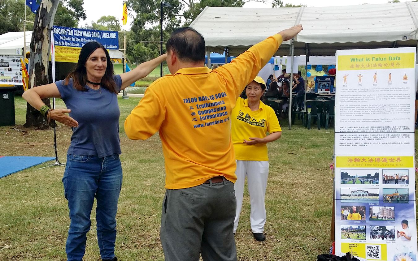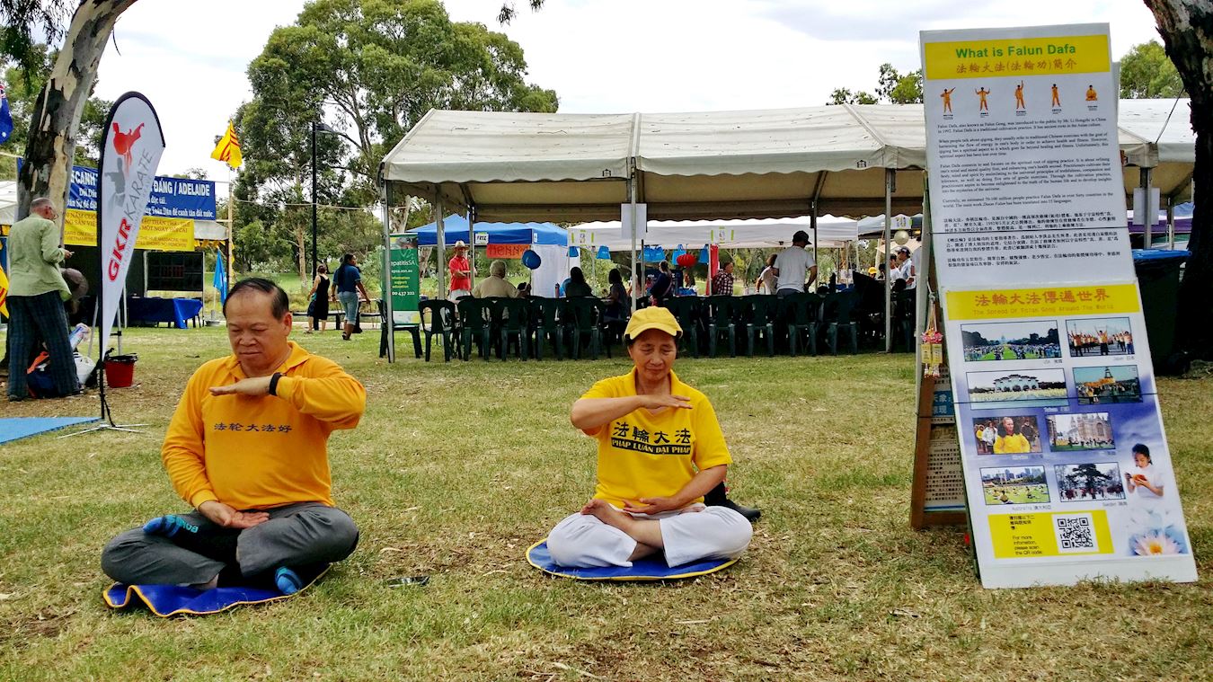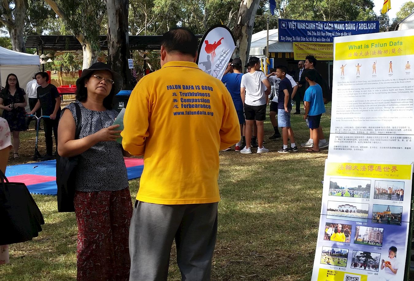 【明慧网二零一八年二月二十四日】南澳越南社区新年嘉年华是当地越南社区最重要的庆祝活动,每年汇集数千当地越裔、州际和国际游客,共同庆祝传统新年这一东南亚大部份国家最重要的节日。二零一八年二月九日周六,南澳法轮功学员再次受邀参加今年的庆典活动,向人们展示祥和的功法和分享修炼的美好。 法轮功学员们在草坪中央摆设展板,展示功法。 |