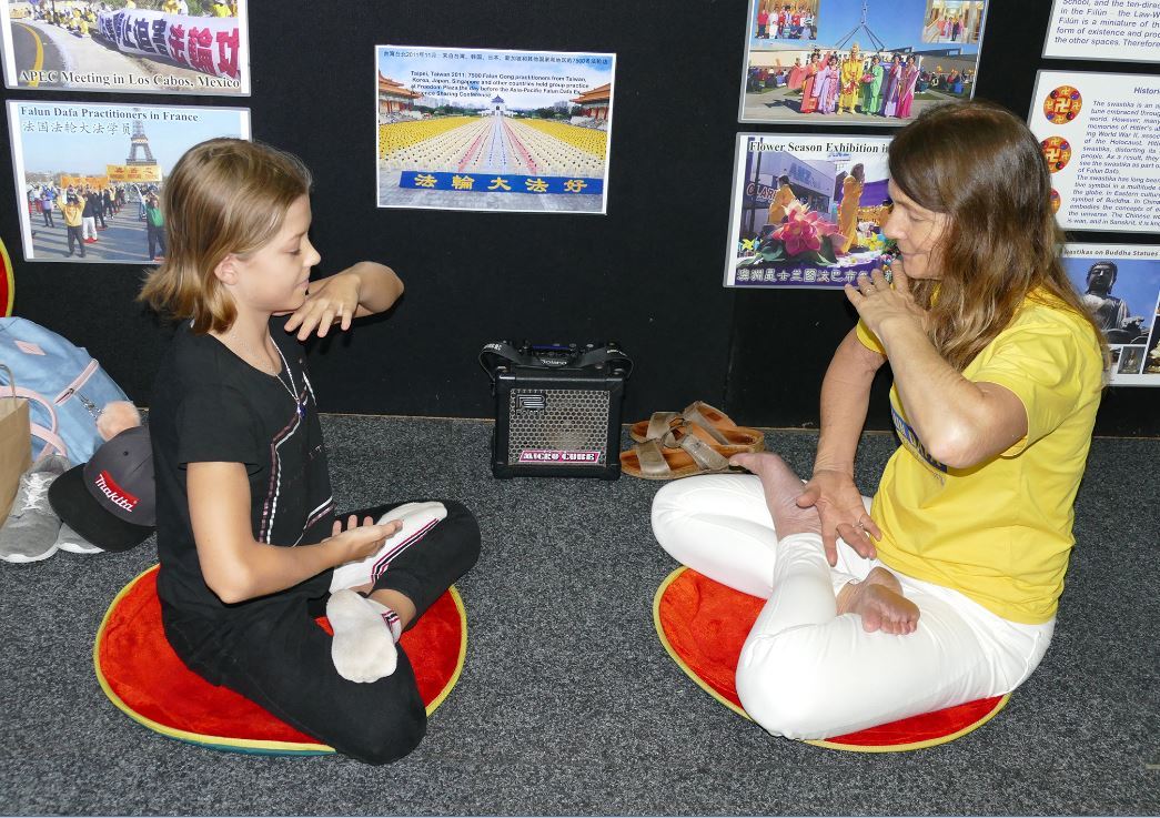 与往年一样,法轮功的展位吸引了众多寻求身心健康的来访者,有些人以前听说过法轮功,也有不少人是第一次听说,他们认真询问法轮功的理念和功效,纷纷表示这就是他们一直渴望找到的功法。有的来访者当即要买《转法轮》,还有人迫不及待地跟学员学炼法轮功。  图3:布莉安娜(Brianna)认真学炼第五套功法 |