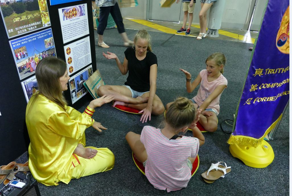 来自Koorlbyn小镇的女孩布莉安娜(Brianna)认真跟学员学炼第五套功法,感觉非常好,又跑去找来大姐阿比盖尔(Abigail)一起学炼法轮功。她说能学法轮功,令她非常激动,非常愉快。  图4:三姐妹学炼法轮功 |