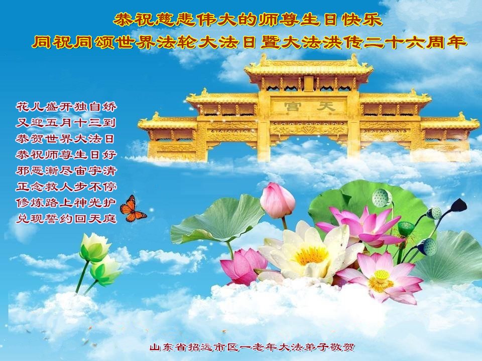 山东省烟台市招远市一老年大法弟子恭祝师尊生日快乐!贺5.13世界法轮大法日!