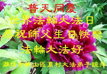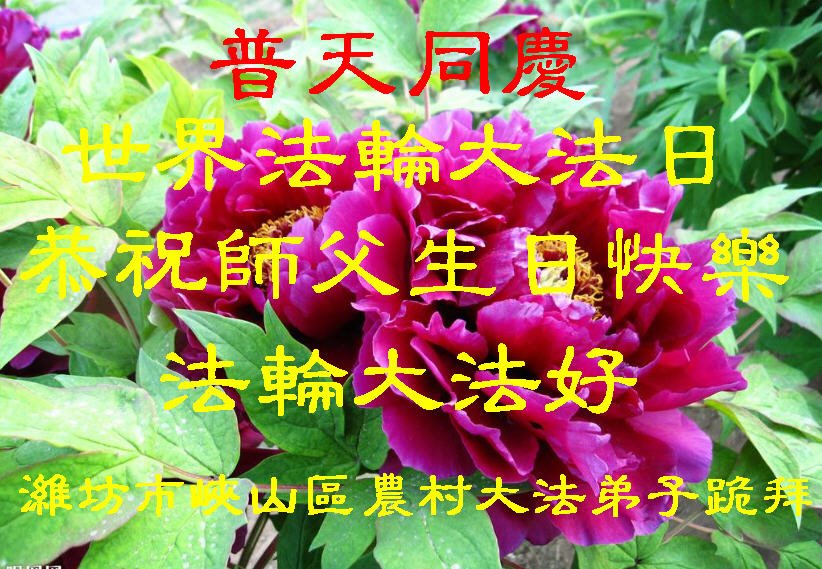 山东省潍坊峡山区农村大法弟子恭祝慈悲伟大的师父生日快乐!普天同庆世界法轮大法日!