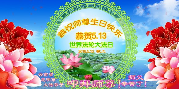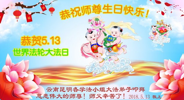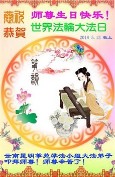 在世界法轮大法日来临之时,普天同庆,我们昆明三个学法小组全体大法弟子怀着无比感恩的心情跪拜我们慈悲伟大的师尊。祝师尊生日快乐!师尊给我们的太多太多,我们做的太少太少,在助师正法的最后时刻,唯有师道我尊言,我们要整体配合好,做好三件事,修好自己,遇事向内找,时时添正念,感谢师尊慈悲救度,谢恩!谢恩!再谢恩! 2018年5月 云南省大法弟子恭祝慈悲伟大的师尊生日快乐!恭贺5.13世界法轮大法日!