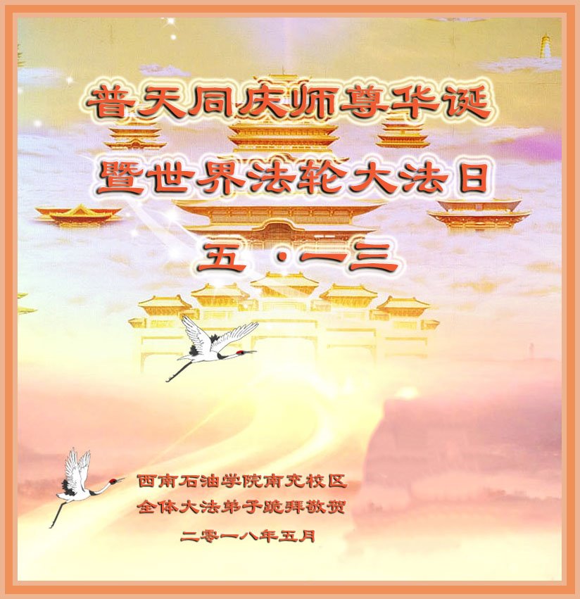 实修以慰师恩 在剜心透骨的魔难中去掉人心 在舍尽一切的执着中开智开慧 在佛性初萌的慈悲中救度众生 在唤醒世人的良知中找回真我 在信师信法的正悟中学会谦卑 在没有捷径的实修中升华自己 在否定旧势力的安排中走正道路 在佛恩浩荡的洪恩中感念师恩 在敬师敬法的法性中顶礼跪拜 在最最纯洁的敬仰中贺师寿诞 西南石油学院四川省南充校区全体大法弟子敬贺师尊华诞暨世界法轮大法日!