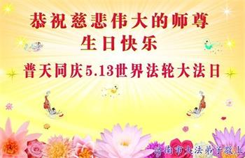 在不断的跟头把式的修炼中,在不断的学法正悟中,在明慧网同修交流体会的帮助下,弟子才逐渐体会到法的伟大和什么叫修炼。当静心学法和背法时,更加明确了原来《转法轮》中师父什么都讲了,能作为正法时期的大法弟子太幸运了。同修们,珍惜大法机缘吧!在世界法轮大法日即将来临之际,谨代表章丘区全体大法弟子恭祝慈悲伟大的师尊生日快乐!感谢师尊的慈悲救度! 山东省济南市章丘区一大法弟子全家五口人恭贺世界法轮大法日!恭祝师尊生日快乐!