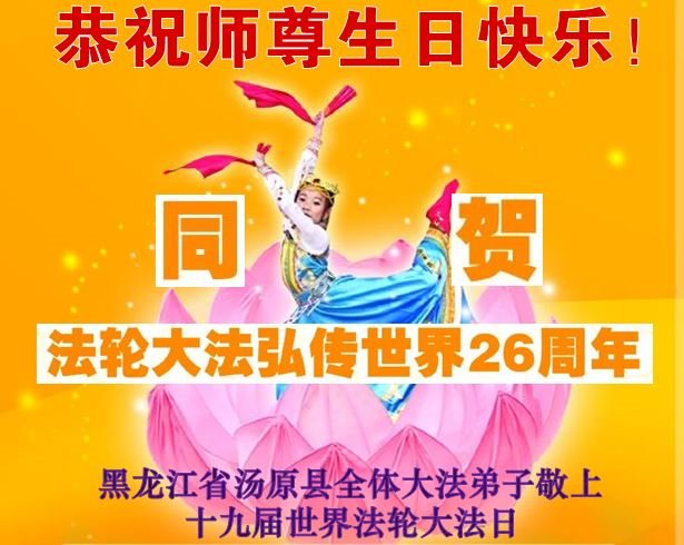 黑龙江省汤原县全体大法弟子恭祝慈悲伟大的师尊生日快乐!同庆第十九届世界法轮大法日!共贺法轮大法洪传世界二十六周年! 黑龙江佳木斯大法弟子恭祝伟大的师尊生日快乐!同庆世界法轮大法日!
