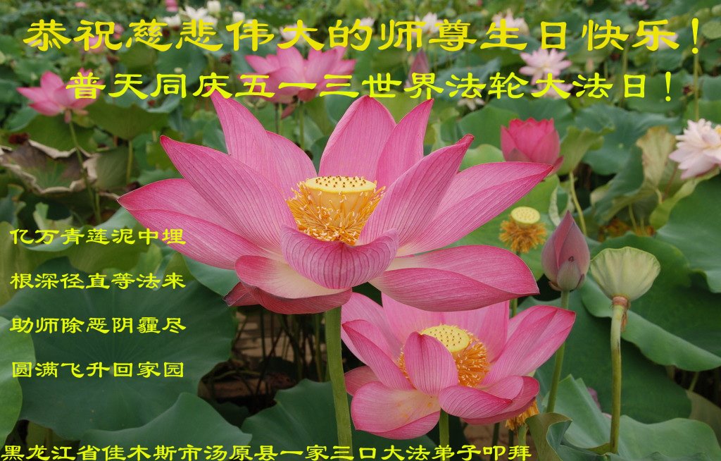 黑龙江省佳木斯市汤原县一家三口大法弟子恭祝慈悲伟大的师尊生日快乐!