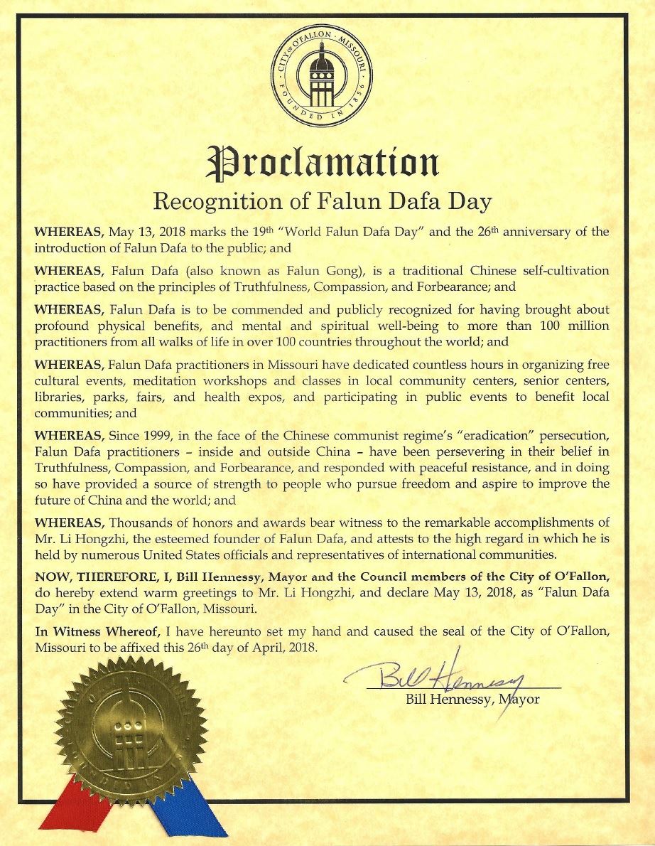 【明慧网二零一八年五月十日】二零一八年五月十三日是第十九届世界法轮大法日,也是法轮大法弘传二十六周年。美国密苏里州圣查尔斯郡的三个城市颁发了褒奖,宣布二零一八年五月十三日为各自城市的“法轮大法日”。 图1:密苏里州奥法隆市(O'Fallon)市长比尔﹒汉尼斯(Bill Hennessy)颁发褒奖,宣布法轮大法日。 |
