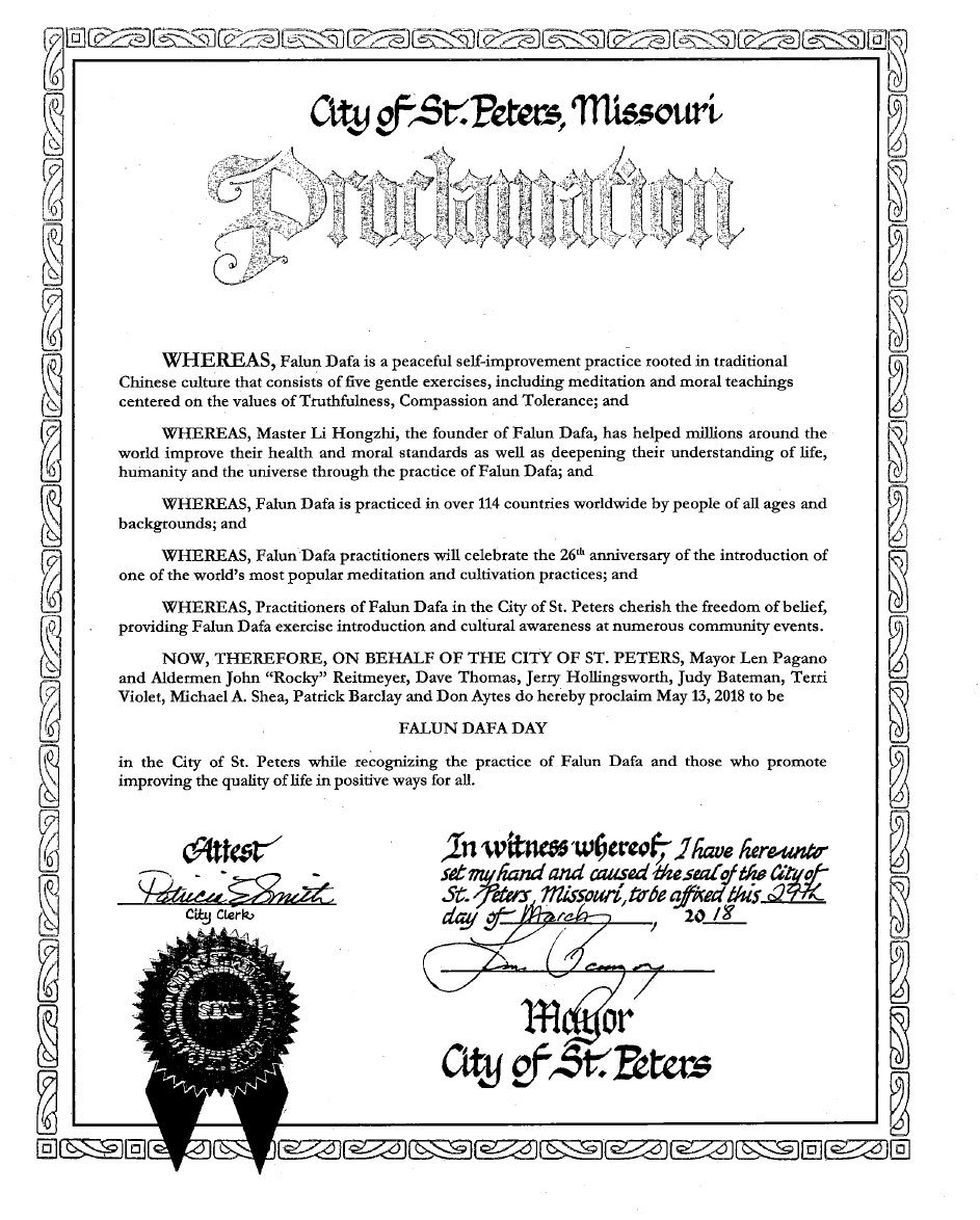密苏里州奥法隆市(O'Fallon)市长比尔﹒汉尼斯(Bill Hennessy)颁发褒奖,宣布法轮大法日。褒奖译文如下: 褒奖庆祝五月十三日“法轮大法日” 鉴于,二零一八年五月十三日标志着第十九届“世界法轮大法日”和法轮大法洪传世界二十六周年;并且 鉴于,法轮大法(又称法轮功),是一种中国传统的基于“真善忍”原则的修炼方法;并且 鉴于,法轮大法给来自世界一百多个国家和地区的社会各界超越一亿修炼者带来了巨大的健康益处,心理和精神的福祉,应该受到公认的表彰;并且 鉴于,密苏里州的法轮大法学员投入了大量时间组织免费的社区活动,在当地的社区中心、老年中心、图书馆、公园、市集、健康博览会等举办教功课程,以及参加公益活动以造福当地的民众;并且 鉴于,从一九九九年起,即使面对来自中国共产党的灭绝迫害,法轮大法学员——无论在中国国内还是国外——都坚守他们对真善忍的信仰,和平抗暴,为那些追求自由和渴望改善世界和中国未来的人们提供了坚强和力量的源泉;并且 鉴于,上千份的荣誉和奖项以及众多美国政府议员和国际社区领袖的高度评价见证了尊敬的法轮大法创始人李洪志先生的卓越成就; 现在,鉴此,我,比尔·汉尼斯,奥法隆市市长和市议会,向李洪志先生致以热烈的问候,并且宣布二零一八年五月十三日为密苏里州奥法隆市的法轮大法日。  图2: 密苏里州圣彼得(St. Peters)市长蓝·帕格诺(Len Pagano)颁发褒奖,宣布法轮大法日。 |