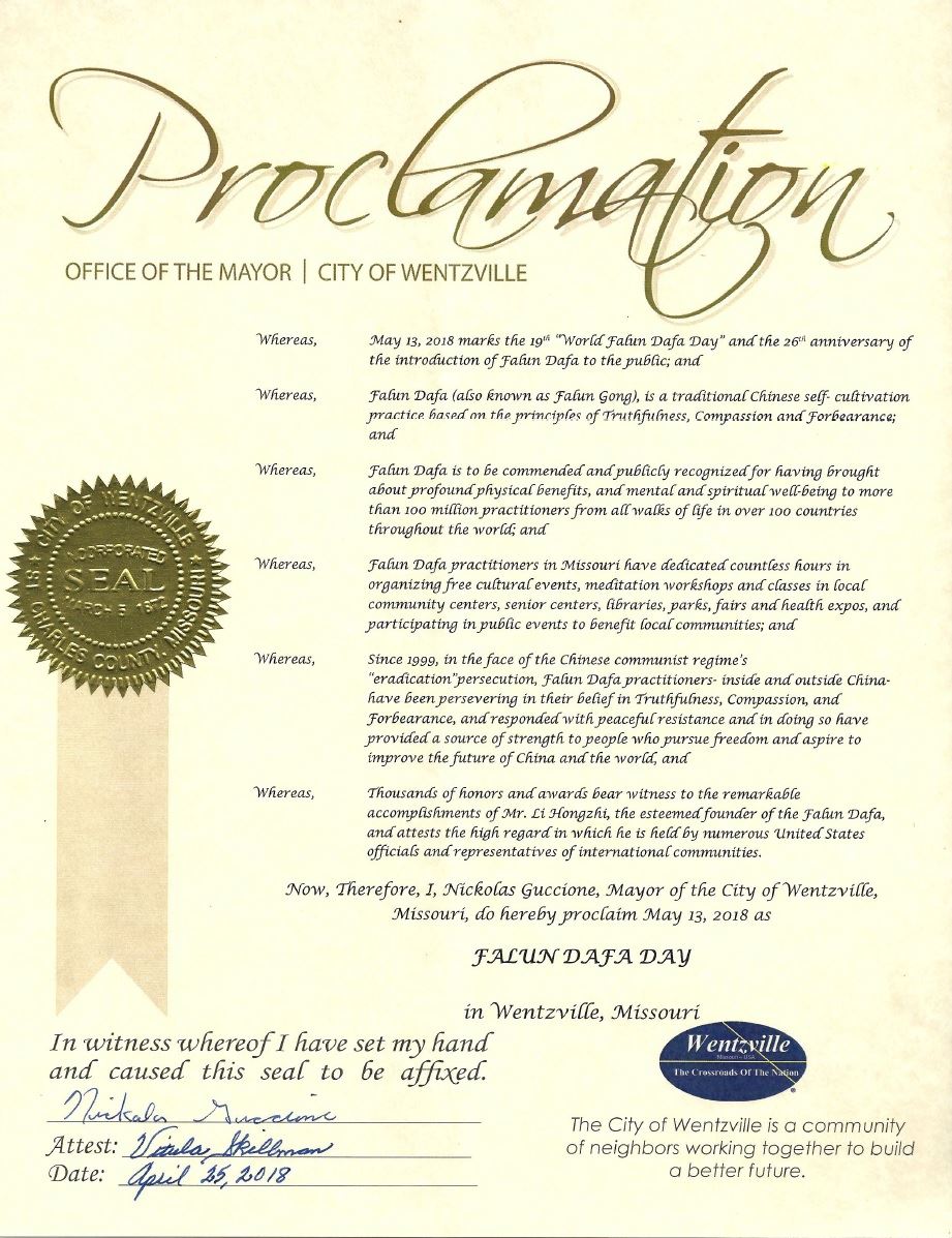 密苏里州温茨维尔市(Wentzville)市长尼古拉斯·古奇昂(Nickolas Guccione)颁发褒奖,宣布法轮大法日。褒奖译文如下: 鉴于,二零一八年五月十三日标志着第十九届“世界法轮大法日”和法轮大法洪传世界二十六周年;并且 鉴于,法轮大法(又称法轮功),是一种中国传统的基于“真善忍”原则的修炼方法;并且 鉴于,法轮大法给来自世界一百多个国家和地区的社会各界超越一亿修炼者带来了巨大的健康益处,心理和精神的福祉,应该受到公认的表彰;并且 鉴于,密苏里州的法轮大法学员投入了大量时间组织免费的社区活动,在当地的社区中心、老年中心、图书馆、公园、市集、健康博览会等举办教功课程,以及参加公益活动以造福当地的民众;并且 鉴于,从一九九九年起,即使面对来自中国共产党的灭绝迫害,法轮大法学员——无论在中国国内还是国外——都坚守他们对真善忍的信仰,和平抗暴,为那些追求自由和渴望改善世界和中国未来的人们提供了坚强和力量的源泉;并且 鉴于,上千份的荣誉和奖项以及众多美国政府议员和国际社区领袖的高度评价见证了尊敬的法轮大法创始人李洪志先生的卓越成就; 现在,鉴此,我,密苏里州温茨维尔市(Wentzville)市长尼古拉斯·古奇昂(Nickolas Guccione),宣布二零一八年五月十三日为苏里州温茨维尔市的法轮大法日。