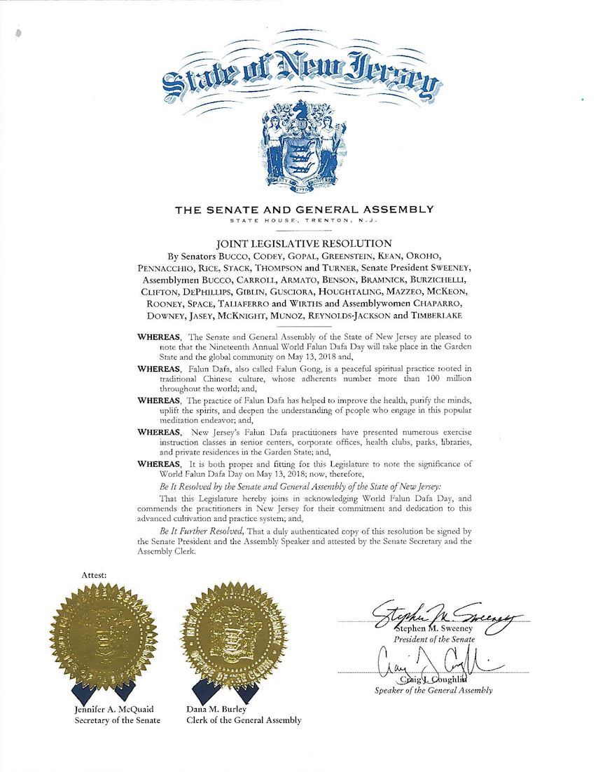 | 【明慧网二零一八年五月十日】第十九届世界法轮大法日到来之际,美国新泽西州参、众议院发表联合决议,庆贺第十九届世界法轮大法日,并赞扬法轮大法有助于改善健康,净化思想,提升心灵,表彰新泽西州法轮大法学员在本州推广法轮大法的努力。 决议案是由州参议员布科(Bucco)发起,三十六位州参、众议员联署。 最后由参议员主席斯威尼(Stephen Sweeney)和 众议院议长考夫林 (Craig Coughlin)联合签发。 决议案译文如下: 参议院和众议院联合决议联署人: (参议员)布科(Bucco), 寇迪(Codey), 戈帕尔(Gopal), 格林斯坦(Greenstein),肯恩(Kean), 奥勒侯(Oroho), 潘纳丘(Pennacchio), 莱斯(Rice),斯塔克(Stack), 汤姆生(Thompson), 特纳(Turner), 斯威尼(Sweeney),(众议员)布科(Bucco), 卡罗(Carroll), 阿玛图(Armato), 本盛(Benson), 布拉姆尼克(Bramnick),布尔齐凯利(Burzichelli), 克利夫頓(Clifton), 迪菲力普斯(DePhillips), 基布林(Giblin), 古索拉(Gusciora), 豪塔林(Houghtaling), 玛泽奥(Mazzeo), 麦基翁(McKeon), 娄尼(Rooney), 斯贝思(Space), 塔里菲娄(Taliaferro),维尔茨(Wirths),查帕娄(Chaparro), 唐尼(Downey), 加赛(Jasey), 麦克乃特(McKnight), 姆努兹(Munoz), 雷诺兹-杰克逊(Reynolds-Jackson)和汀布莱克(Timberlake) 鉴于新泽西州参议院和众议院欣喜地注意到第十九届世界法轮大法日将于二零一八年五月十三日在花园州和全球社区举行; 鉴于法轮大法也被称为法轮功,是一种植根于中国传统文化的和平精神实践,在全世界的信仰人数超过1亿; 鉴于法轮大法的实践有助于改善健康,净化思想,提升心灵,使参与这一大众冥想努力的人加深对生命的理解; 鉴于新泽西州法轮大法学员在花园州的老年中心、企业办公室、健身俱乐部、公园、图书馆和私人住宅举办了许多学习班; 鉴于本立法机构在二零一八年五月十三日注意到世界法轮大法日的重要性,因此,现在, 由新泽西州参议院和众议院联合决议: 本立法机构特此共同表彰世界法轮大法日,并赞扬新泽西州的修炼者对这个高级修炼体系的专注和奉献精神;并且, 进一步决定,经由参议院议长和众议院议长签署并由参议院秘书和众议院秘书证明,经正式认证的此决议版本。 参议院议长斯威尼(Stephen Sweeney)(签字) 众议院议长考夫林 (Craig Coughlin)(签字)