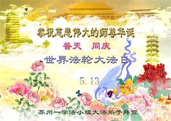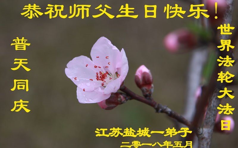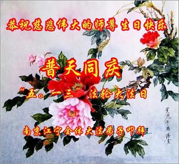 普天同庆“五一三”世界法轮大法日! 师父您辛苦了!弟子用尽人间语言也无法表达对师尊的感恩,唯有坚修大法紧随师,正念正行报师恩! 南京江宁全体大法弟子叩拜 江苏盐城一弟子恭祝师父生日快乐!
