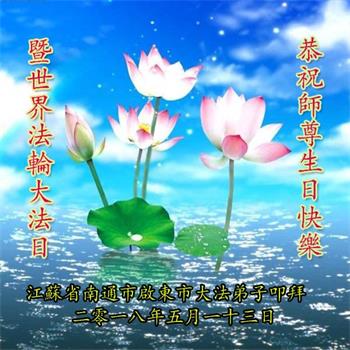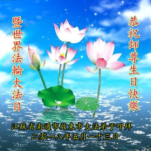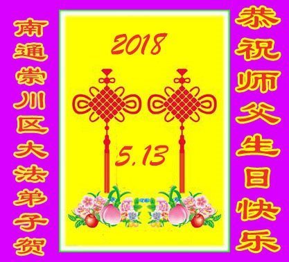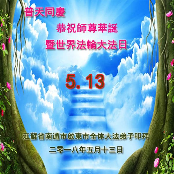 在这普天同庆的日子里,弟子们怀着感恩的心,庆祝5.13世界法轮大法日!恭祝师父生日快乐!感谢师父慈悲救度。 江苏淮安大法弟子 (三人学法小组) 二零一八年五月七日 江苏省南通市启东市大法弟子祝贺师尊生日快乐!暨世界法轮大法日!