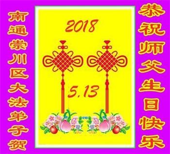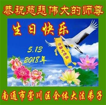 一晃一年一次的全世界法轮大法日!又到了,在这普天同庆的日子里,我们南通市崇川区全体大法弟子,一定要按照师尊的要求做好三件事,大家尽心尽力多多救人,用自己最好的修炼成果来回报师尊的救度洪恩! 南通市崇川区全体大法弟子叩拜师尊! 2018年5月8日 江苏省南通市崇川区大法弟子恭祝师父生日快乐!