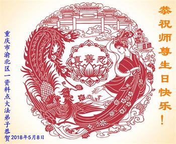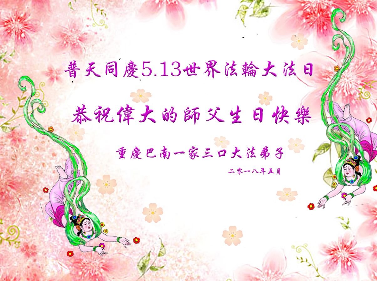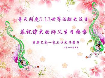 【明慧网二零一八年五月十一日】 重庆市巴南区一家三口大法弟子恭贺法轮大法日!恭祝师尊生日快乐!