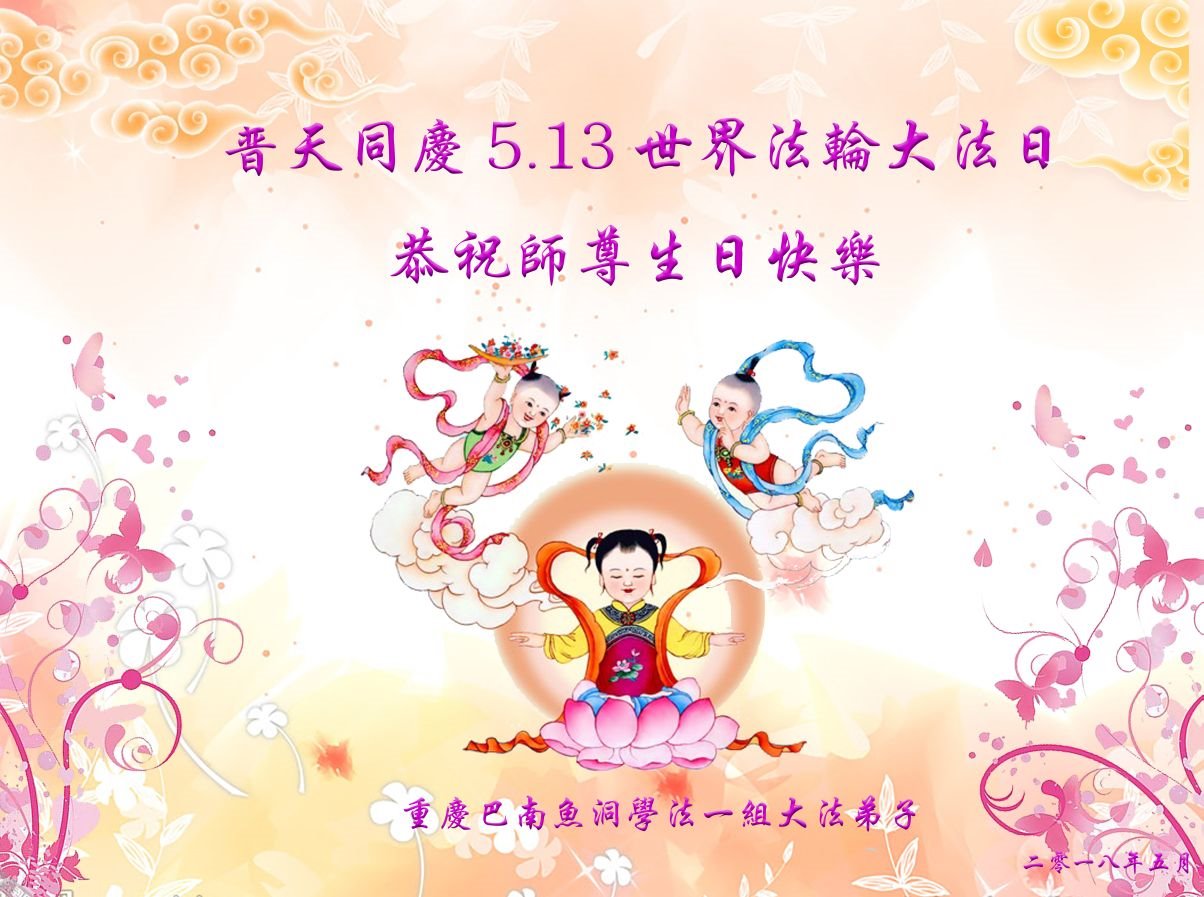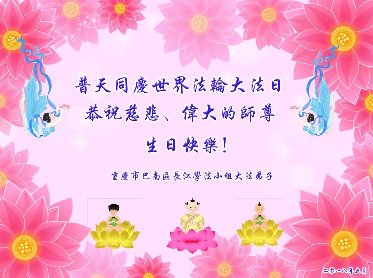 在5.13世界法轮大法日!这普天同庆的日子里,我们学法小组全体大法弟子恭祝慈悲伟大的师父生日快乐!感谢师尊慈悲苦度,用心学好法,正念正行,做好三件事,多救人。在最后不多的日子里精進、再精進! 二零一八年五月 重庆市巴南区长江学法小组大法弟子恭贺法轮大法日!恭祝师尊生日快乐!