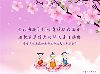 重庆沙坪坝区新桥大法弟子恭贺5·13世界法轮大法日!暨伟大师父华诞!祝师父生日快乐! 2018年5月8日 重庆九龙坡区满圆春学法小组全体大法弟子恭祝慈悲伟大的师尊生日快乐!