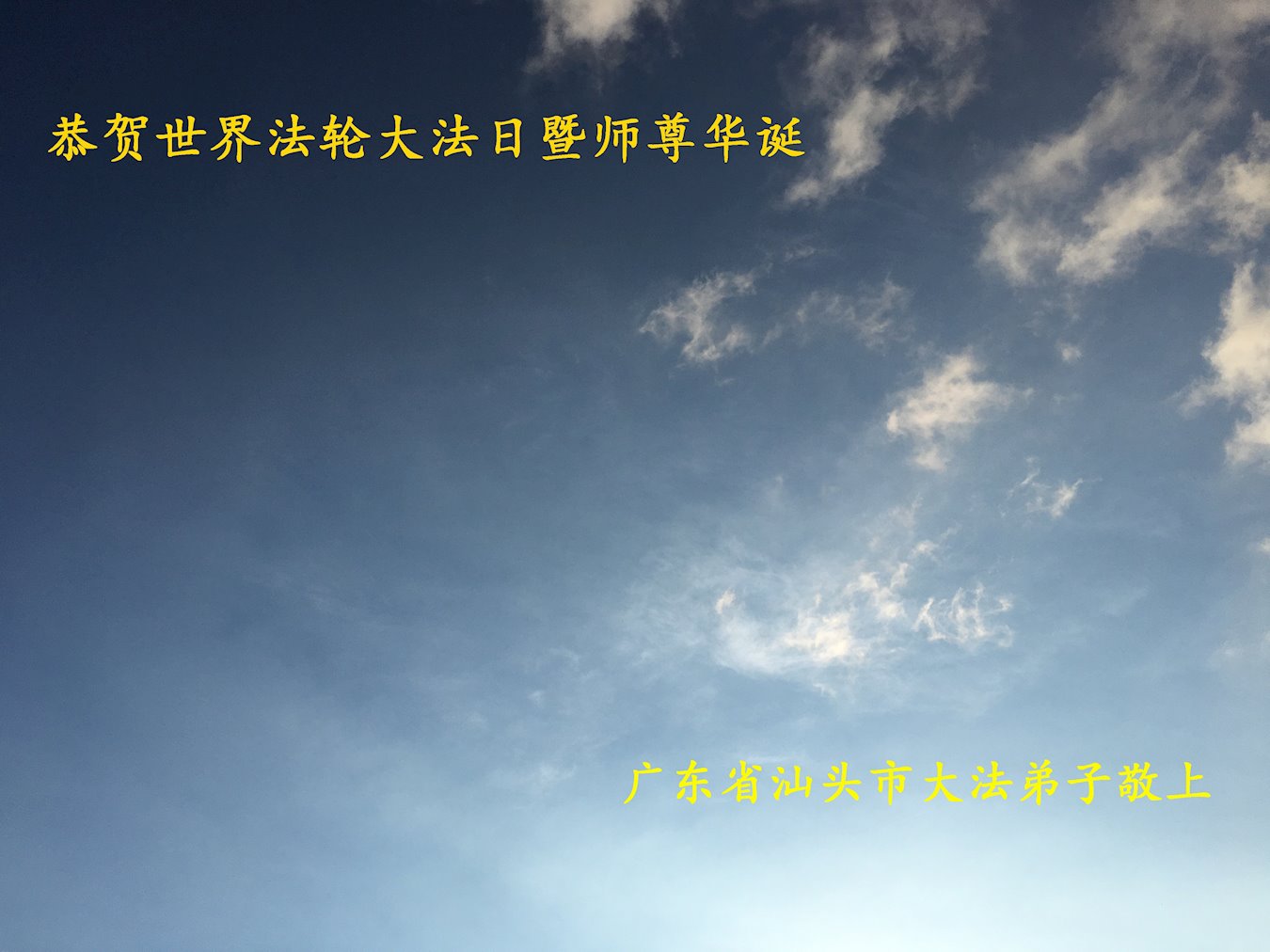 恭祝慈悲伟大的李洪志师父生日快乐! 正法时间飞快!网上法会刚过,转眼又到了世界法轮大法日!和师尊的生日。 梅州全体大法弟子一定坚定走好走稳最后的修炼路,尽量多救众生,圆满随师还! 广东省汕头市大法弟子恭贺法轮大法日!