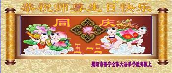 恭祝慈悲伟大的师尊生日快乐!普天同庆世界法轮大法日!暨大法洪传二十六周年!感谢师尊的慈悲苦度,我们一定珍惜这万古机缘,听师父的话,做好三件事,踏踏实实讲真相,多救人,完成救度众生的伟大使命。 揭阳市普宁市全体大法弟子叩拜 广东潮州大法弟子恭祝师尊生日快乐!暨世界法轮大法日!