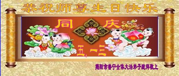 广东省梅州市梅江区、梅县区及梅州城区全体大法弟子恭贺世界法轮大法日!恭祝慈悲伟大的李洪志师父生日愉快! 广东省汕头市大法弟子恭贺法轮大法日!