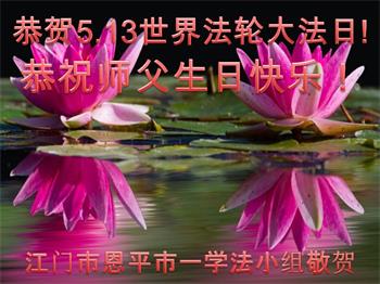 广东省江门市恩平市一大法弟子携家属恭贺法轮大法日!