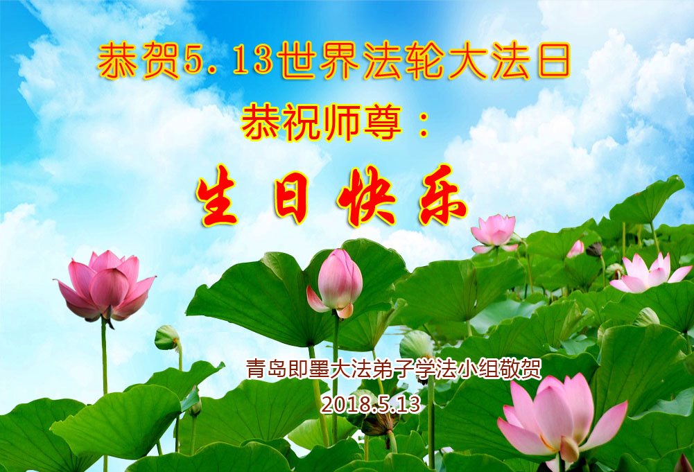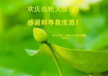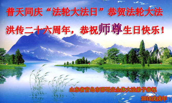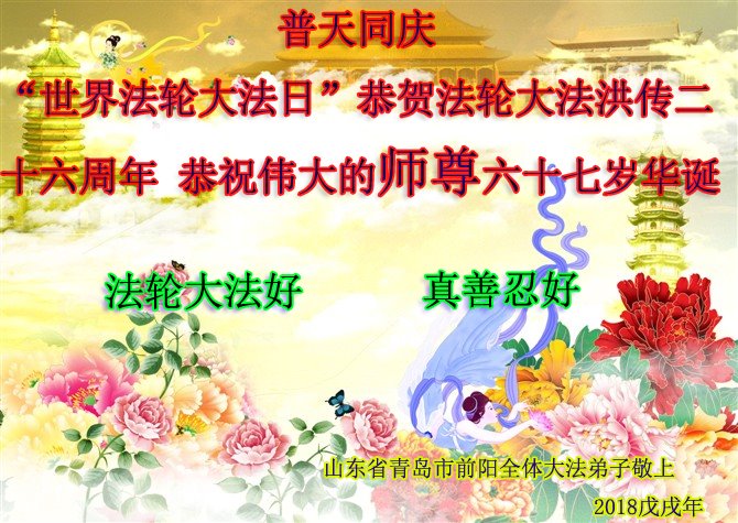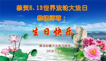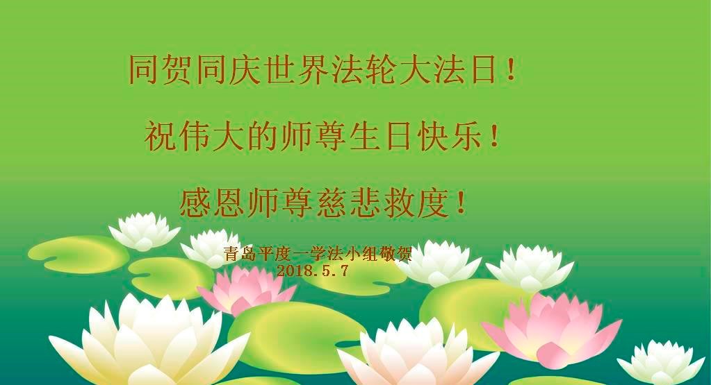 【明慧网二零一八年五月十一日】 山东青岛郑庄大法弟子恭贺法轮大法日!