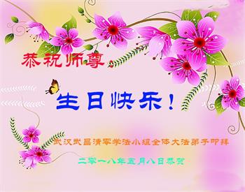 【明慧网二零一八年五月十一日】 湖北省武汉东西湖将军路一学法小组大法弟子恭祝师尊生日快乐!普天同庆5.13法轮大法日!