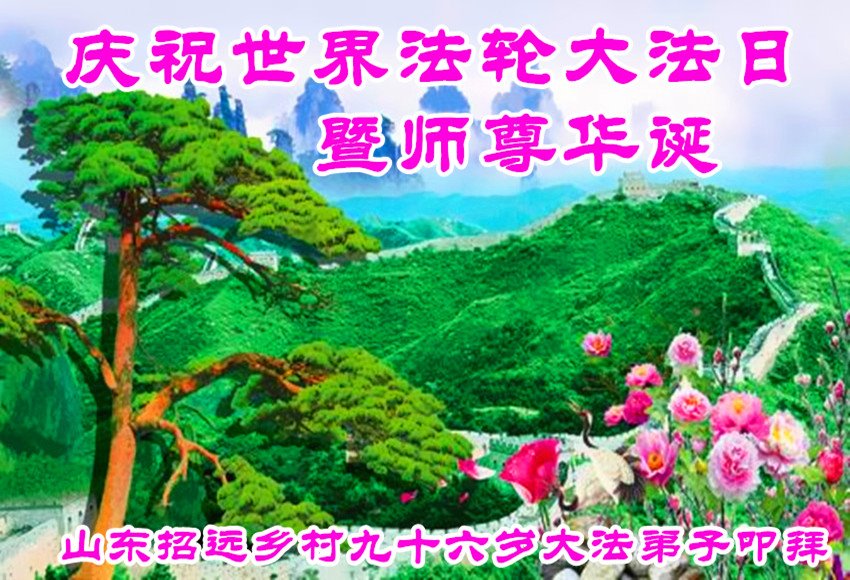 在世界法轮大法日到来之际,我们学法小组全体同修向恩师致诚挚的祝贺!同时祝恩师生日快乐! 并献上我们心中的歌: 大法日颂歌 法轮大法好 法轮大法好 大法颂歌彻九霄 世界法轮大法日 万水千山齐欢笑 法徒众生歌且舞 同祝恩师佳节好 法轮大法好 法轮大法好 大法颂歌如春潮 恩师末世救苍生 亿万年等待今已到 欢声笑语乐滔滔 同祝恩师佳节好 法轮大法好 法轮大法好 大法颂歌声势浩 恩师末世正大穹 开创新宇彩虹娇 天蓝地绿百花放 同祝恩师佳节好 法轮大法好 法轮大法好 大法颂歌心窝掏 师救众生千百亿 功高更比五岳高 大法无边金光照 同祝恩师佳节好 石家庄边远农村一学法小组敬贺 山东烟台招远市乡村九十六岁大法弟子恭祝师尊生日快乐!