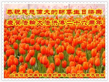 弟子能走到今天,离不开师尊的慈悲保护,为不争气的弟子,师尊不知操了多少心,弟子深感惭愧,弟子唯有精進实修,修好自己,多救人,才能对得起期盼我们的众生。我们一定谨记师尊的教导,走师父安排的路,跟师父回家。再次谢谢师父!我仅代表我们地区的学法小组恭祝祝师父生日快乐! 莱西市平度市农村学法小组大法弟子敬上 河北省邯郸市曲周县东南农村老年夫妻大法弟子恭贺师尊华诞暨世界法轮大法日!