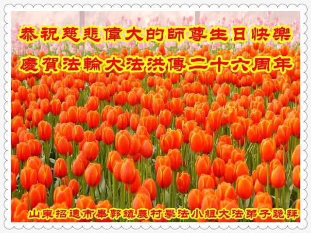 在法轮大法洪传二十六周年之际,弟子向最伟大的师尊问好:师尊您好!师尊您辛苦了! 二十几年来,无不感到师尊为我们的付出与保护,从没放弃过我这个不争气的弟子,师尊给予我们太多太多,我只有听师尊的话,做好三件事,不辱使命,弟子叩拜师尊! 大法洪传全世界 师尊拯救穹苍宇 唤醒世人明真相 众生感恩泪流涕 大法弟子齐协力 铲除妖魔使法力 神通大显惊天地 正念除魔恶党毙 河北乡村一老年学法组大法弟子祝师尊生日快乐!