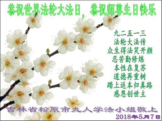 我是吉林省松原市一名老年大法弟子,弟子恭祝师父生日快乐!弟子坚信师父,就听师父的话,跟师父回家! 祝贺世界法轮大法日! 二零一八年五月七日 吉林松原市一九人学法小组大法弟子恭贺世界法轮大法日暨师尊华诞!