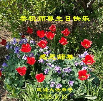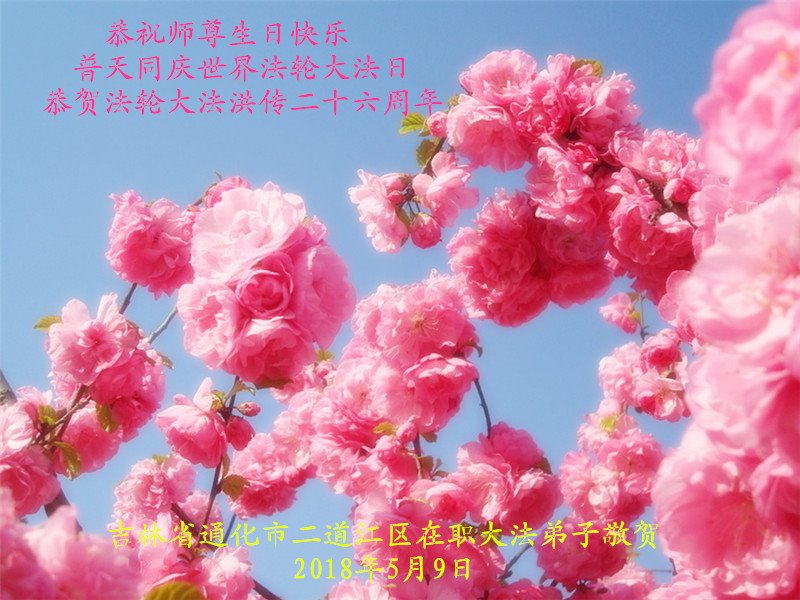 在这普天同庆5·13世界法轮大法日的欢庆时刻,我们学法小组的三名老年大法弟子共同叩拜师父,恭祝师父生日快乐!恭祝世界法轮大法日! 在此,我们感恩师父的慈悲救度,感恩师父赐给我们“真、善、忍”宇宙大法。我们要珍惜这万古机缘,百分之百的信师信法,多学法,学好法。做好三件事,走师父安排的路,修好自己,多救人。感恩师父!感恩大法! 师父!弟子想念您!恭祝您生日快乐! 吉林省通化市一学法小组 二零一八年五月九日 吉林省延边州延吉市敦化一大法弟子恭祝师尊生日快乐!