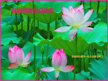 主佛慈悲救大穹 法轮转动乾坤正 法徒助师讲真相 世人得救道德升 喜逢师尊华诞日 莲开九朵遥相贺 吉林省通化大法弟子恭祝慈悲伟大的师尊生日快乐!恭贺世界法轮大法日!