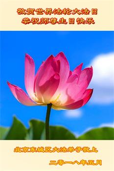 尊敬的无限慈悲的师父:您好! 为救度危难中的众生您承受着人们难以想象的巨难,大法弟子与得救世人无以为报,只有听师父您的话,才不辜负您的期望。 值此5.13世界法轮大法日之际,谨向慈悲伟大的师尊您问候: 师父辛苦了!祝师父生日快乐! 谨献学诗一首: 洪恩 一生苦追求 生生尘中流 末劫大法度 洪恩创世主 谢谢您! 弟子叩拜 合十 北京市一退休采矿专业高级讲师大法弟子 二零一八年五月 北京大法弟子恭祝慈悲伟大的师尊生日快乐!热烈庆祝“世界法轮大法日”!