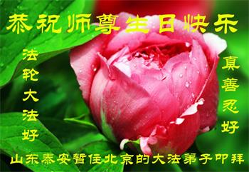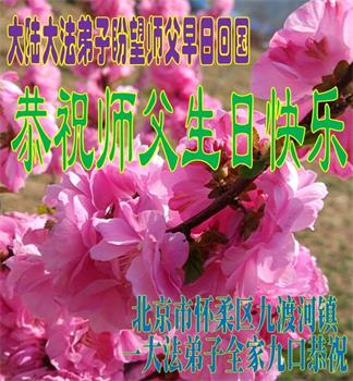 师父好!师父生日快乐!大陆大法弟子盼望师父早日回国。 北京市怀柔区九渡河镇一大法弟子全家恭祝 山东泰安暂住北京的大法弟子恭祝师尊生日快乐!