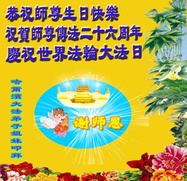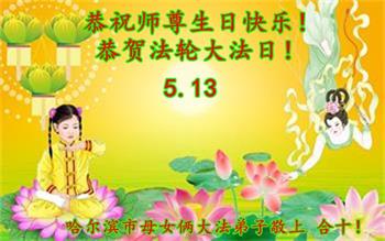 黑龙江省哈尔滨大法弟子姐妹叩拜师尊生日快乐!祝贺师尊传法二十六周年!庆祝世界法轮大法日!