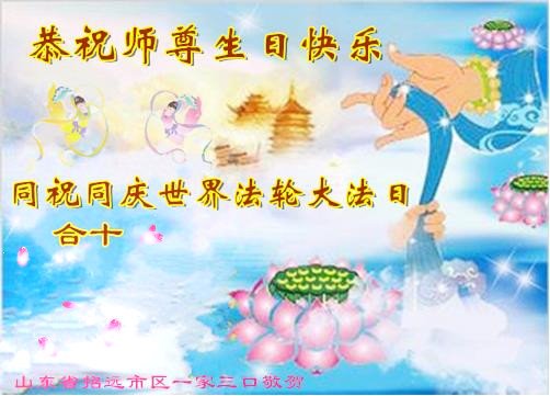 山东省烟台市招远市区一家三口大法弟子恭祝师尊生日快乐!