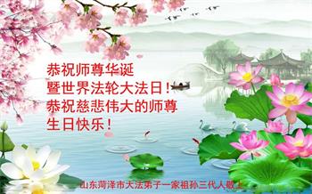 山东菏泽市一大法弟子及家人恭祝慈悲伟大的师尊生日快乐!恭贺世界法轮大法日!