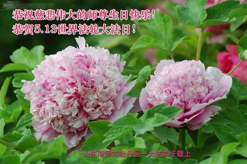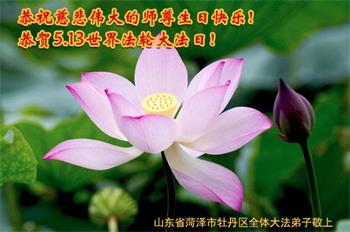 山东菏泽市牡丹区大法弟子恭贺5.13世界法轮大法日!恭祝慈悲伟大的师尊生日快乐!