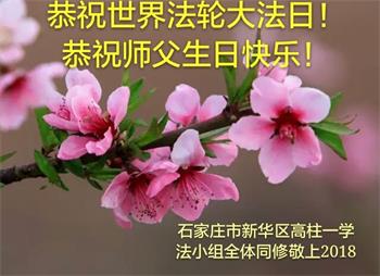 在世界法轮大法日即将来临之际,我们联盟路学法小组全体同修恭祝师父生日快乐!恭祝世界法轮大法日!在这么多年当中是慈悲伟大的师尊为每个弟子操尽了心,才使我们走过了那些关难才能走到今天千言万语难以表达对师尊的感激之情。我们只有更好的做好三件事加紧救人,实修自己不辜负师尊对我们的呵护,只有感谢·感谢·再感谢。 石家庄市联盟路学法小组全体同修敬上 二零一八年四月二十三日 河北省石家庄谈固小区一名大法弟子恭祝师尊生日快乐!