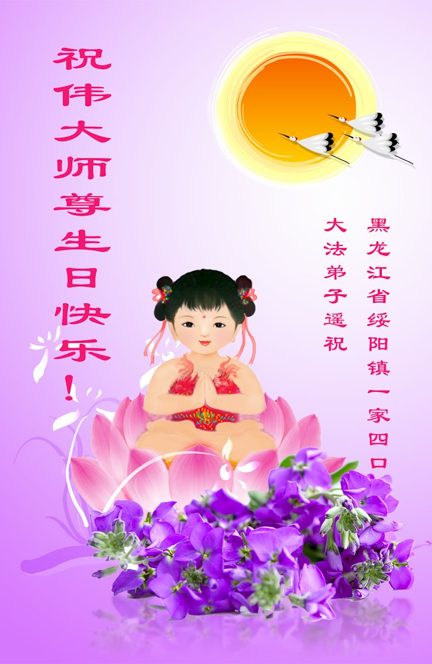 黑龙江省绥阳镇一家四口大法弟子恭祝师尊生日快乐!