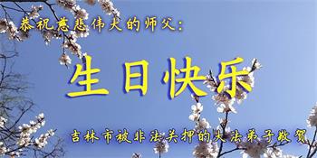 我是天津市一老年大法弟子,被非法关押在看守所迫害一年。虽然恶警把我绑架到看守所,但我也绝不在旧势力安排魔难中修炼,全盘否定旧势力的一切安排,坚定的走师父安排的修炼道路;不忘自己是大法弟子,在任何环境下都承担着证实法、讲真相救度众生的使命。 同时还要学好法,修好自己,保持每天两小时的炼功时间;开创了证实法、学法、炼功、讲真相救度众生的宽松环境。这三百六十五天都是在师父的引领、呵护下平稳的走过来的。 师父经常用法、常人的嘴点化我;第一次点给我的法是:“功修有路心为径 大法无边苦作舟”(《洪吟》〈法轮大法〉);最后点给我的法是:“濁世清莲亿万梅 寒风姿更翠”(《洪吟二》〈梅 元曲〉)。当时我激动的掉下了眼泪,心中喊着师父,谢谢师父、谢谢师父。悟到在这个复杂的环境中,修好自己、改变观念,把吃苦当成乐、把吃苦当作舟,这个复杂的环境是修心的好机会。坚定的走正、走稳、走好师父安排的修炼道路,圆满跟师父回家。 真心向内找自己,修自己、归正自己,吸取教训,坚定信师、信法的正念,放下生死。绝不配合邪恶的任何命令和指使,進看守所不体检,一路零签字。坚定正念邪恶自灭,真正的领悟到正念来自于法的威力。千言万语道不出弟子对师父的感恩。唯有坚持正念,做好三件事,抓紧机会救度众生报答师父救度之恩。在此跪拜:恭祝师父生日快乐!谢谢师父!谢谢师父! 二零一八年四月八日 吉林市被非法关押的大法弟子恭祝慈悲伟大的师尊生日快乐!