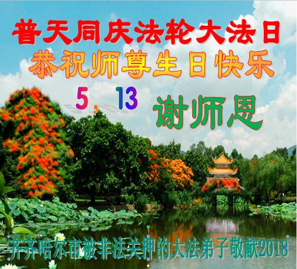 普天同庆“五一三”世界法轮大法日! 黑龙江省齐齐哈尔市被非法关押全体大法弟子向师尊合十敬献! 黑龙江省伊春市金山屯二位被非法关押在佳木斯监狱的大法弟子恭祝慈悲伟大的师尊生日快乐!